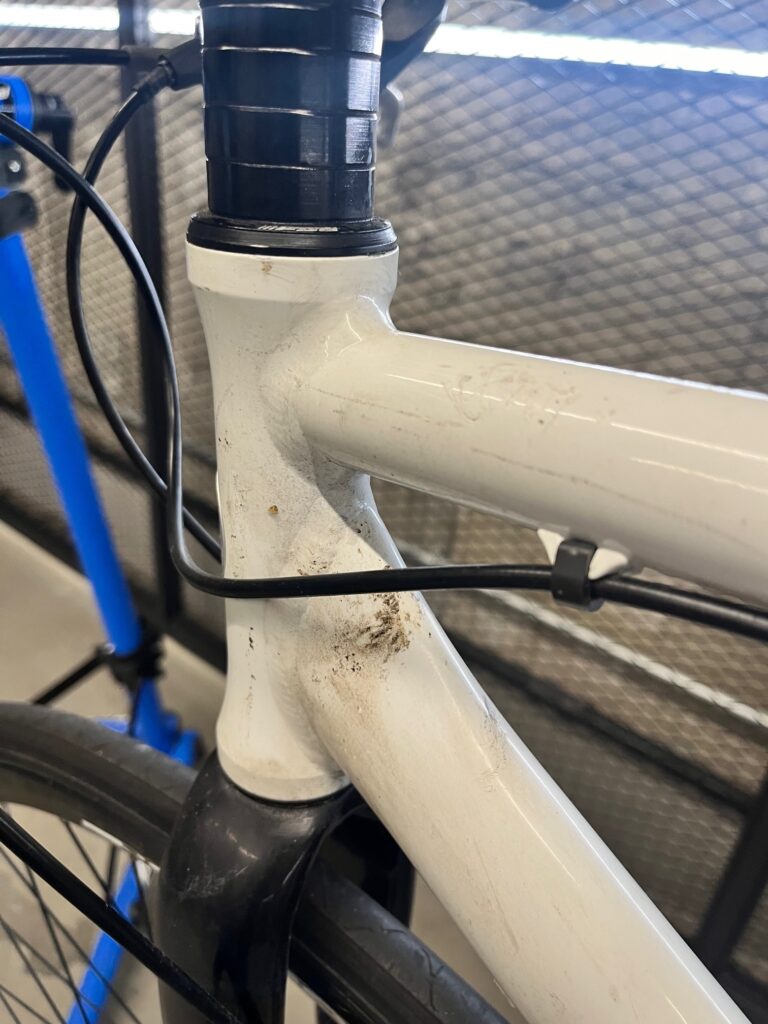 これがなかなか厄介なシミで、、、塗装面のクリア層をブレーキのアウターワイヤーが削り取っているため、一生懸命このシミを落としても仕上りはそこだけ艶消しの塗装面になります。