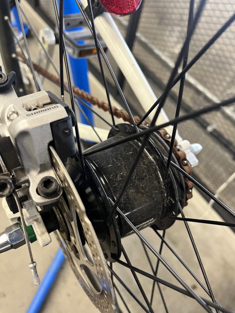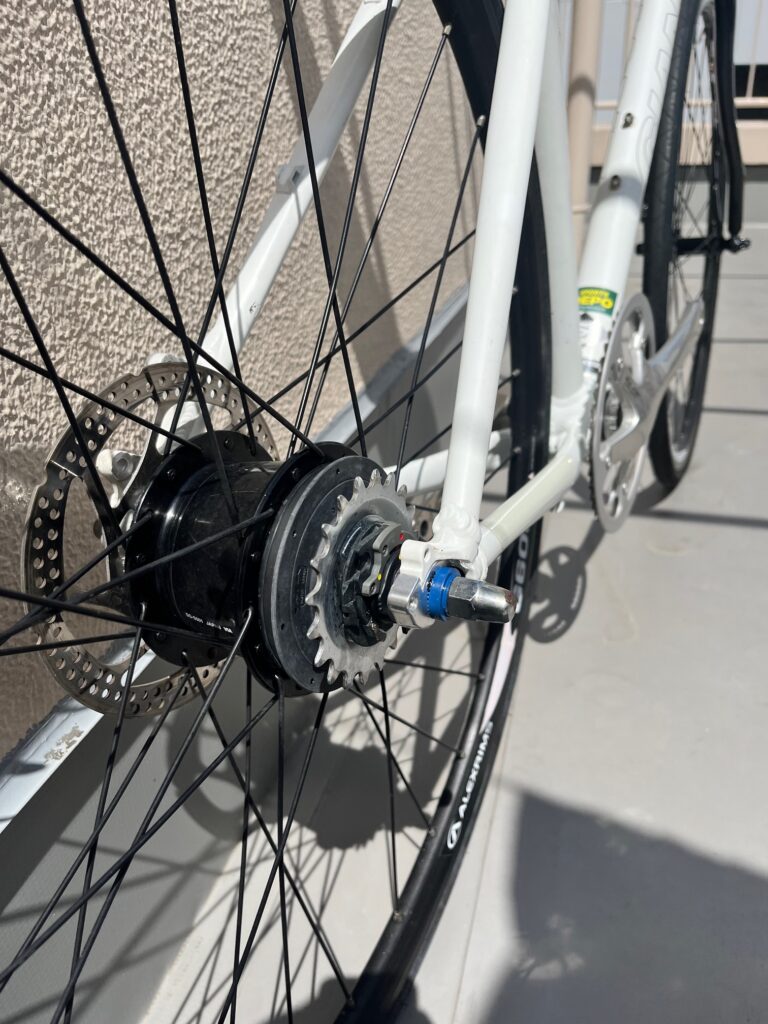 こちらリアハブのALFINEさんです。個人的には内装ハブは大好きですが、欠点として、、重い。 メンテナンスを考えると外装変速より圧倒的に壊れにくく掃除も楽!でも重い。