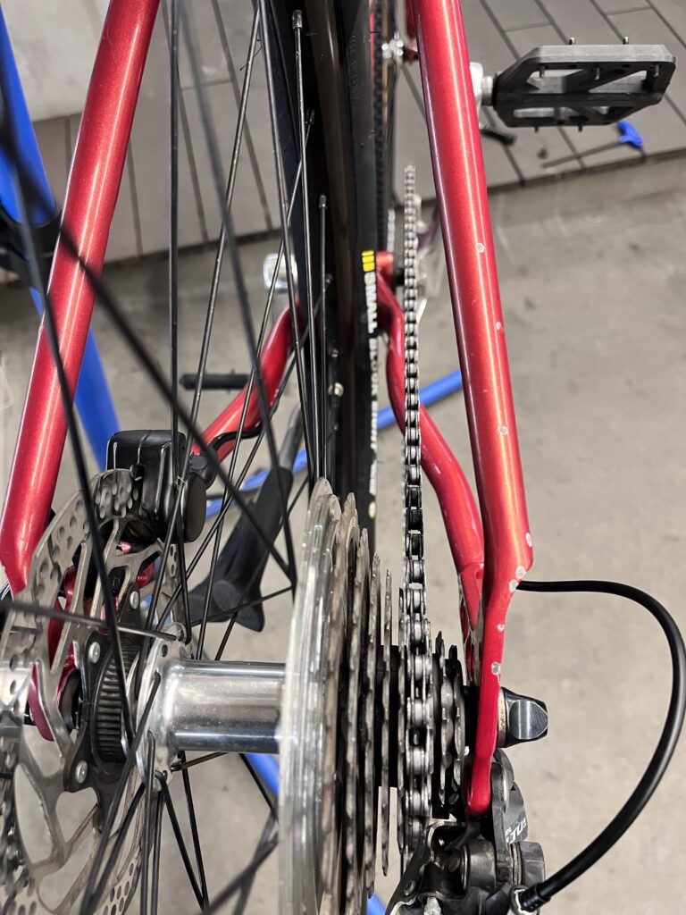 ドライブ側のチェーンステーとクランクのチェーンリングのクリアランスも1mm外に出たため少し余裕ができました。