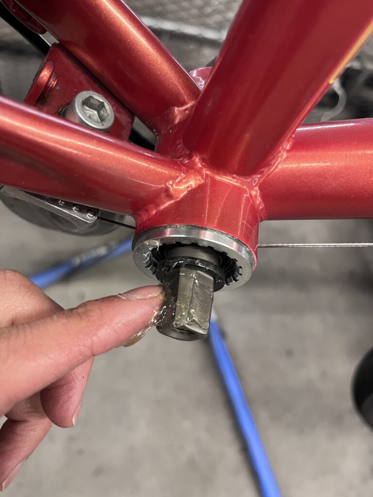BBが組み付けられたら、軸にグリスを塗布します。これはクランクがアルミニウムのためスチール製のBB軸と固着しクランクの交換やメンテナンス時に外れないことを防ぐために行います。