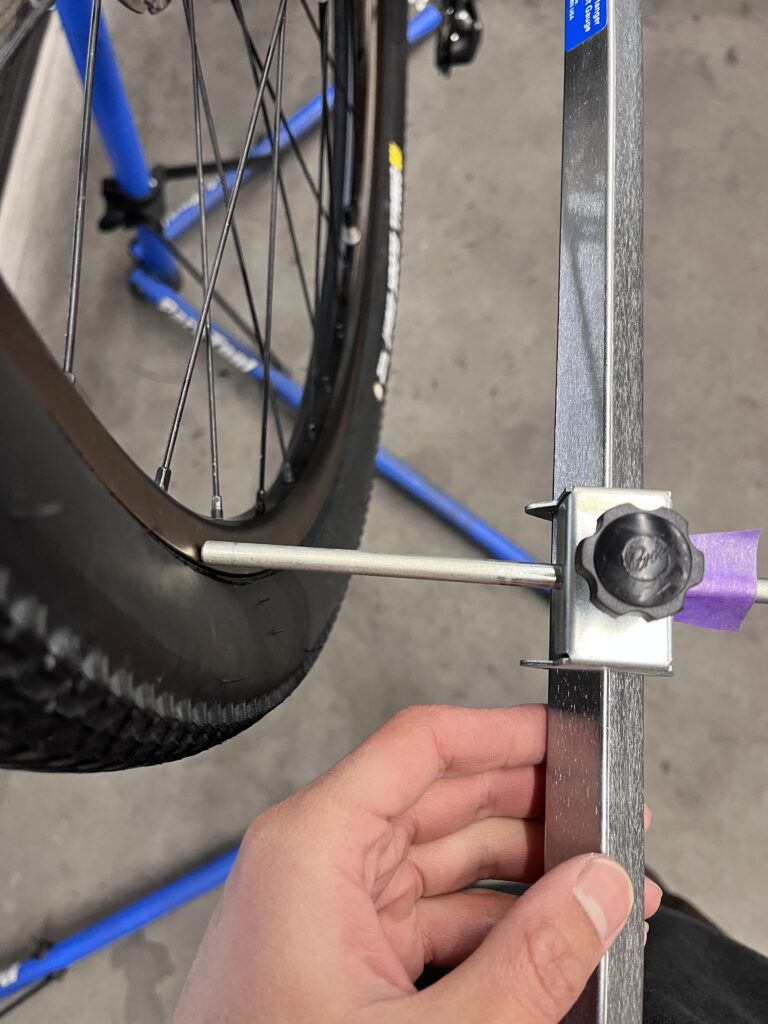 写真のようにリアホイールの前後2カ所と上下2カ所に棒を当て4カ所のどの位置からリムに棒を当てても距離が同じに丸ように調整していきます!