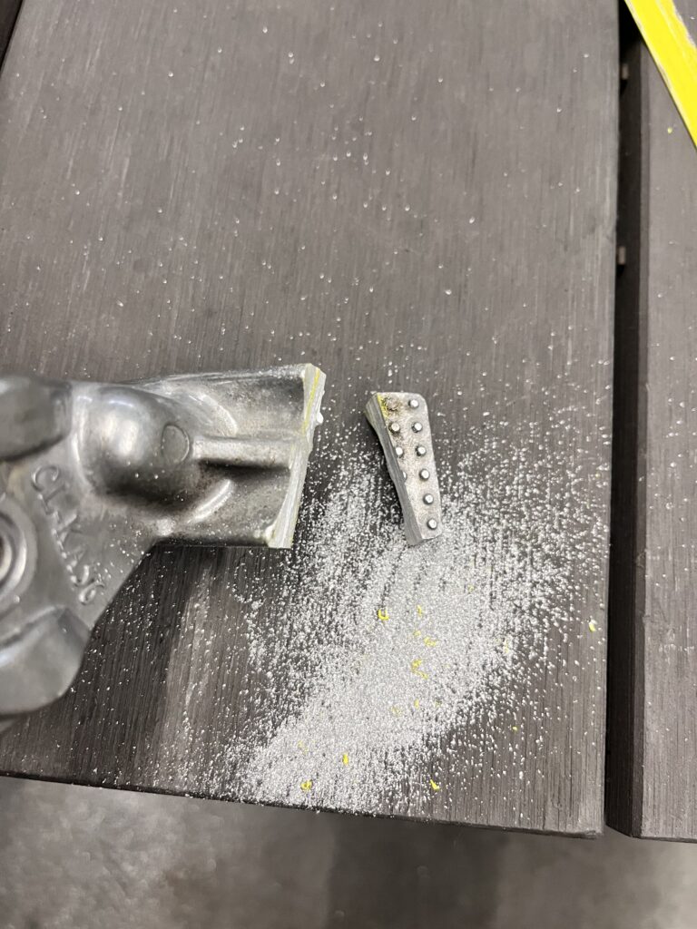ワイヤが干渉するラインで切断し、センタースタンドの強度も落ちてしまうことも考慮しつつ切り落とす範囲は最小限にします!