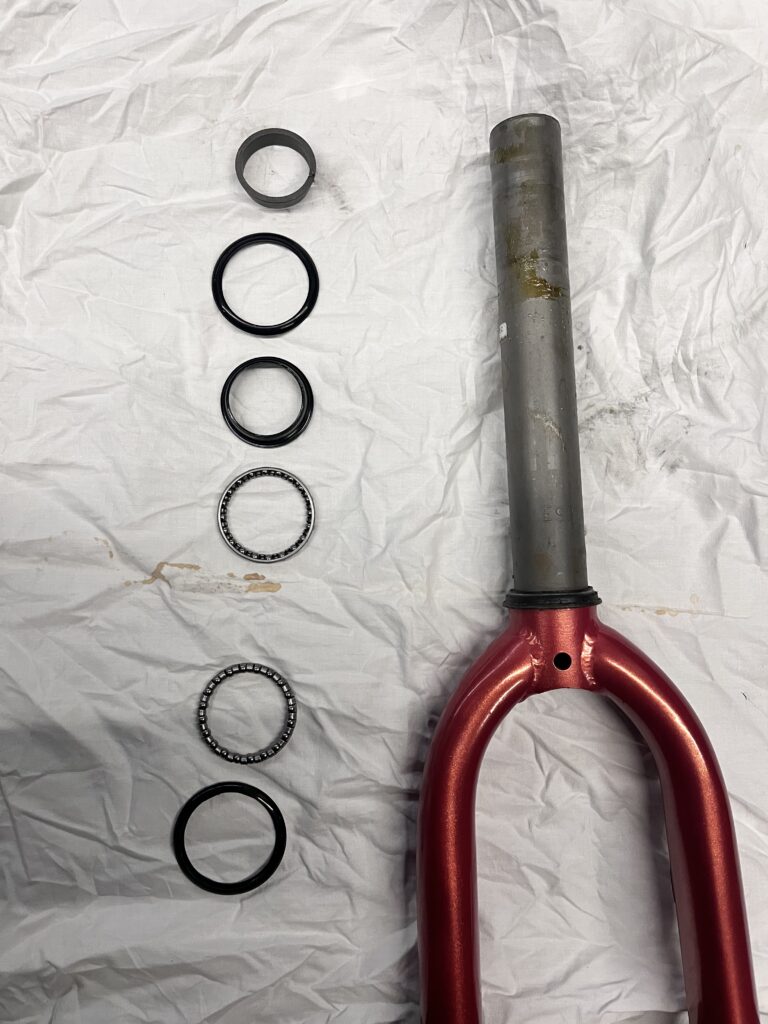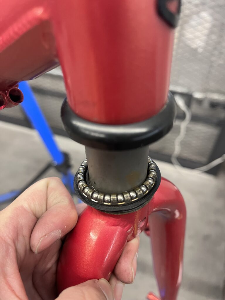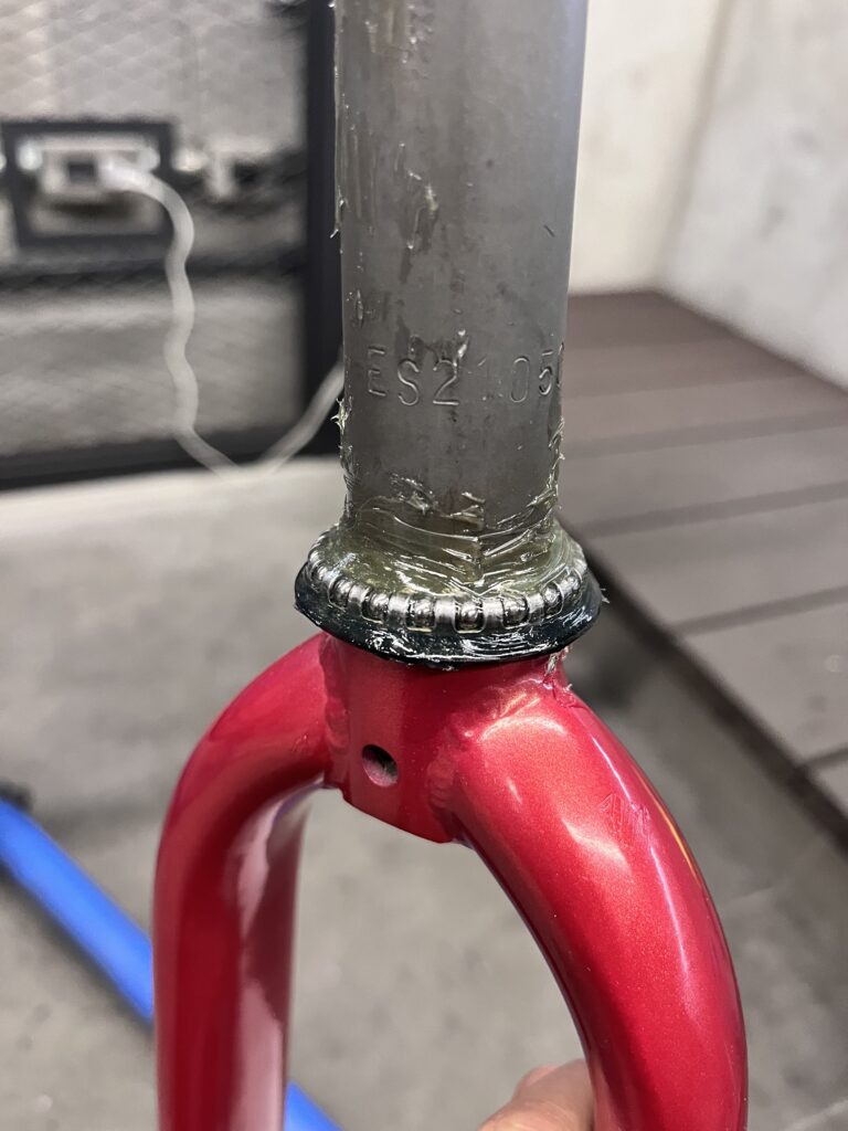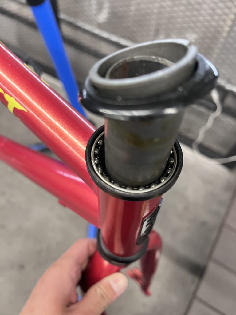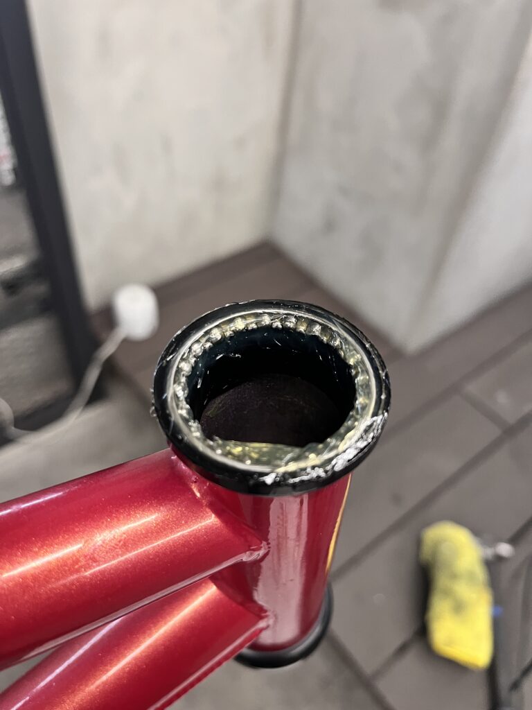 フレーム側も綺麗に洗浄します。ヘッドチューブ内に少し錆びが見えますね。