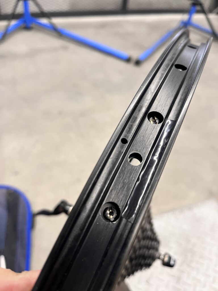 片方のホイールで4カ所。多いな。当時のリムでも2カ所だけだったのにと思いながら全て塞ぎました。