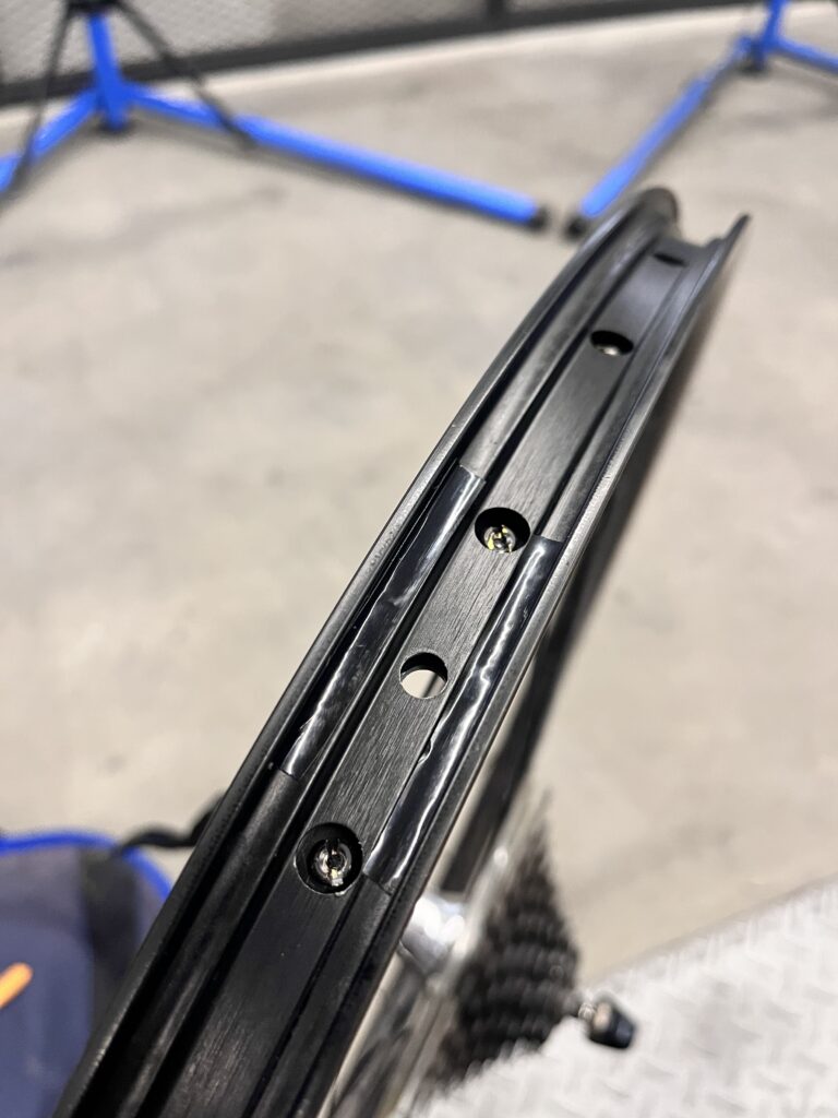リムの製造過程で開けられたと考えられるこの穴。そういえばバイト時代に販売していた自転車でおんなじような現象が起きていたような、、、